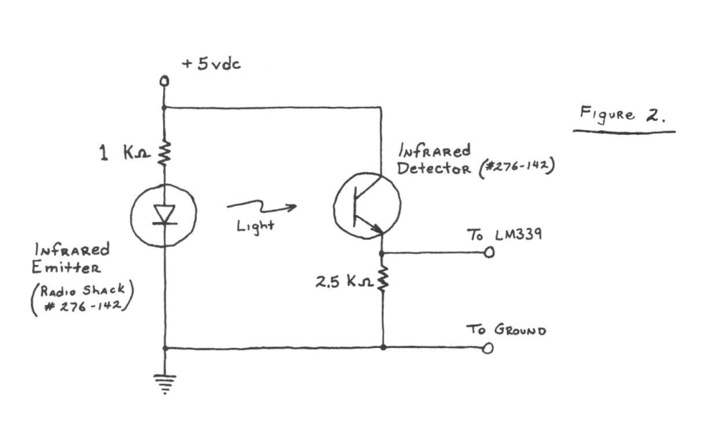While you’re waiting for the epoxy to harden, begin work on the electronic portions of the anemometer. As mentioned previously, a light emitter and detector circuit must be located at the rotor. It must be positioned so that the light path between the two will be broken by the mending plate as it spins. Use the schematic diagram and the drawing shown in figure 2 as a guide in fabricating the circuit on a small piece of perfboard. Use about 6 inches of lead wire soldered to both the infrared emitter and detector.
