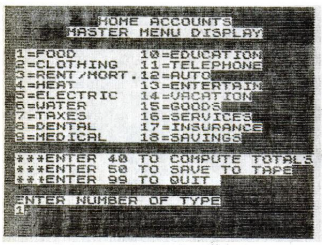 Some of the 37 graphics characters appeared and disappeared on the screen as he ran a quick test program. Minutes later, a home-finance program (the one shown in the printout photo, next page) was entered from tape, proving the computer can get down to business.