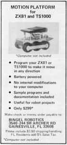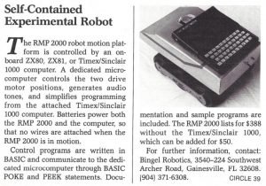 RMP 2000 Robot Motion Platform (Bingel Robotics) was designed specifically for use with the ZX80, ZX81, or T/S 1000. Priced at $388 without the computer ($438 with), it featured an onboard dedicated microcomputer that controlled two drive motor positions and generated audio tones. Users wrote control programs in BASIC that communicated with the dedicated microcomputer through POKE and PEEK statements. The system was entirely battery-powered, allowing untethered operation.