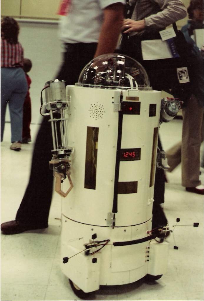 Taylor’s robot design was based on a Radio-Electronics magazine reprint series titled “Build this robot for under $400.” The robot featured a cylindrical body approximately 16 inches in diameter with drive wheels placed in the front for traction and maneuverability. The computer and expansion boards were mounted on top and underneath the hinged body.