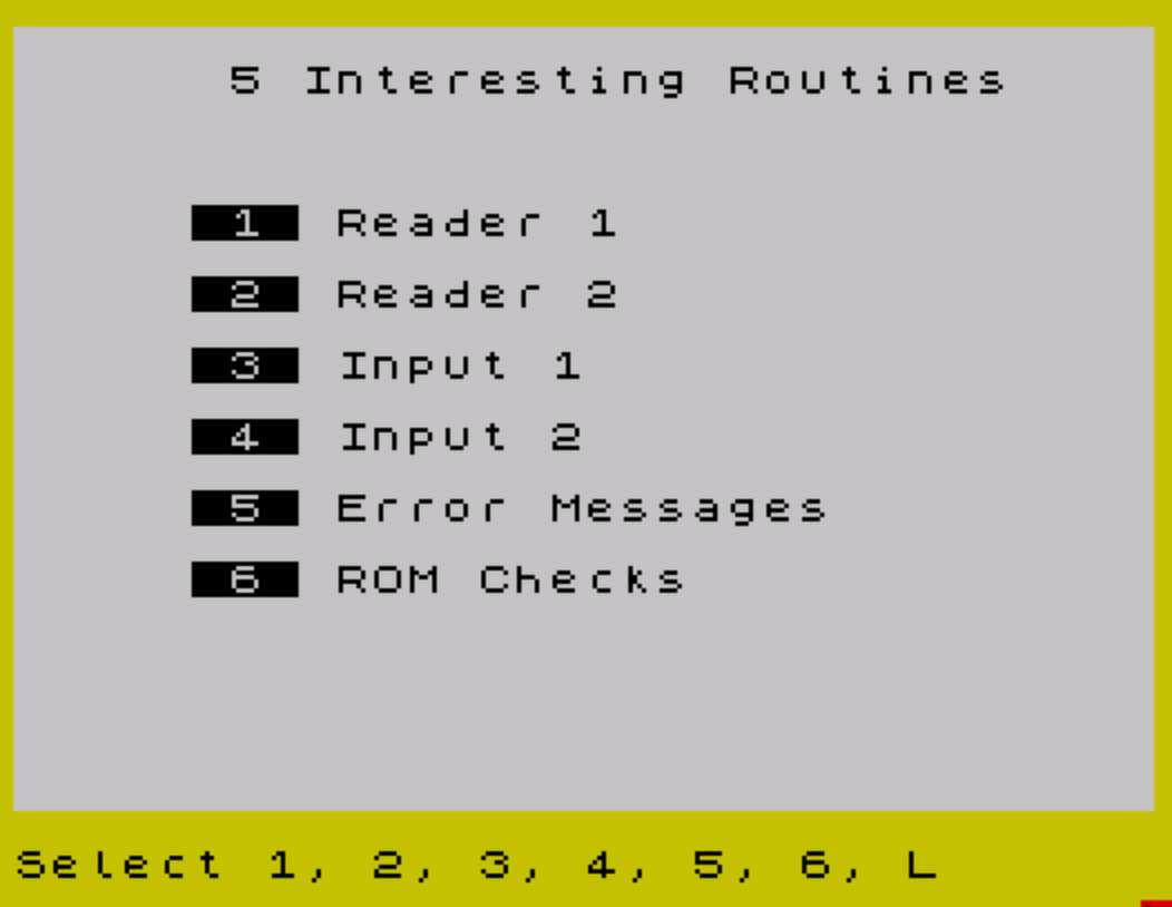 2520 PRINT '''" 1 Reader 1"''" 2 Reader 2"''" 3 Input 1"''" 4 Input 2"''" 5 Error Messages"''" 6 ROM Checks"
