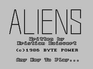 The title screen’s oversized “ALIENS” lettering is constructed from custom block characters, a technique frequently employed by BASIC programmers to simulate large display fonts without a dedicated font engine.