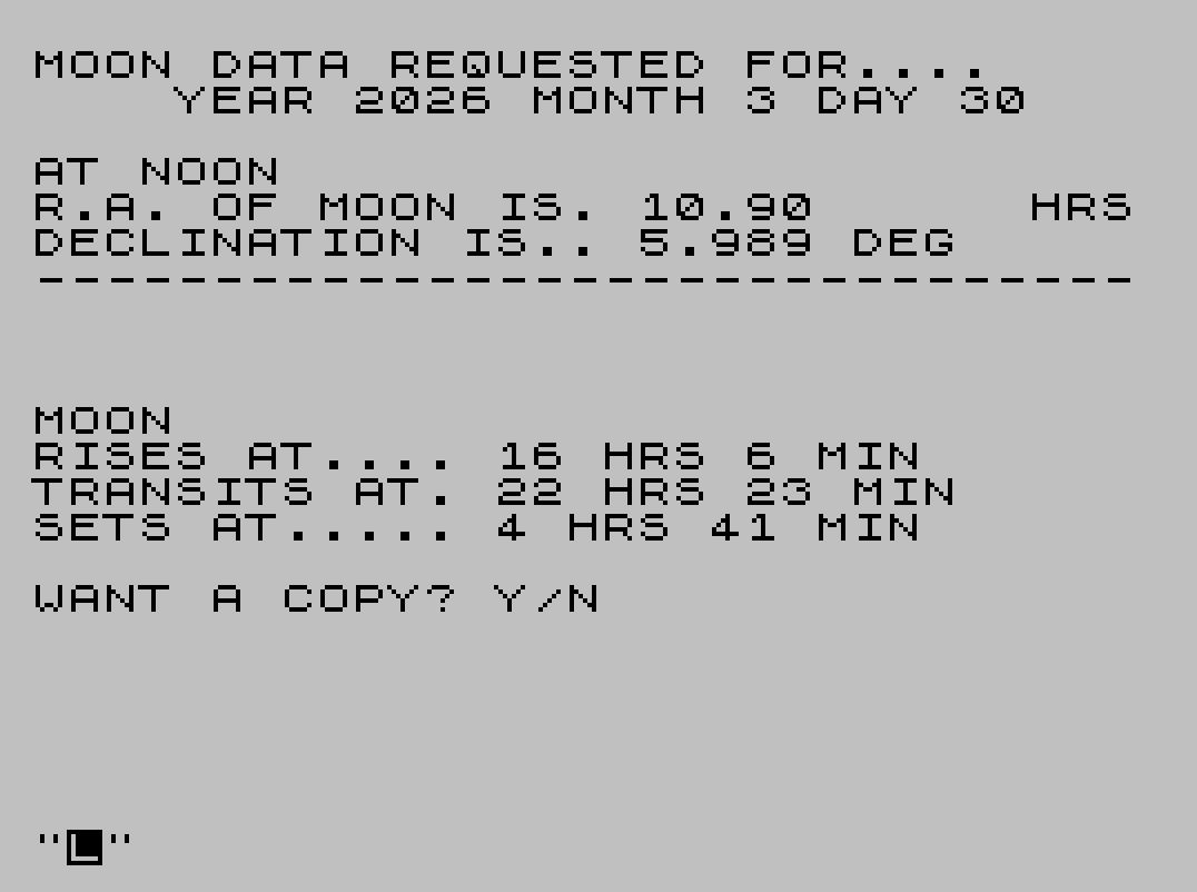 2910 PRINT "MOON DATA REQUESTED FOR...."