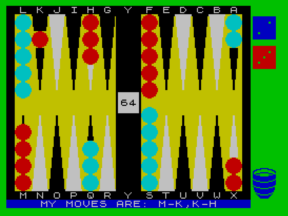he game features a graphical board with animated rolling dice and doubling cube support, with move selection handled by machine code for fast response.