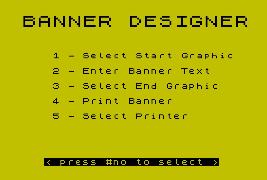 140 PRINT AT 13,6;"4 - Print Banner"