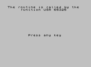 80 PRINT AT 1,2;"The routine is called by the";TAB 7;"function USR ";x