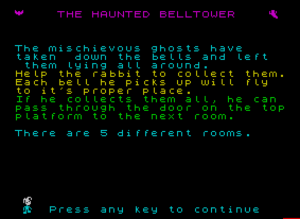 “The Haunted Belltower” is a multi-room platform game in which the player guides a rabbit character through five rooms — entrance hall, wine cellar, staircase, bats’ bedroom, and haunted belfry — collecting bells while avoiding bats. The game uses 15 user-defined graphics (UDGs “a” through “o”) whose bitmaps are loaded via DATA statements and POKEd into UDG memory starting at USR “a”, with a guard at address 63000 to avoid reloading them unnecessarily. Two enemy bats move toward the player using attribute-based collision detection via the ATTR function, and a bouncing ball death sequence plays when the player is caught. Room layouts, platform positions, bell locations, and rope data are all encoded in DATA blocks at lines 8100–8503, with each room’s data selected by RESTOREing to offset 8000+100*z.