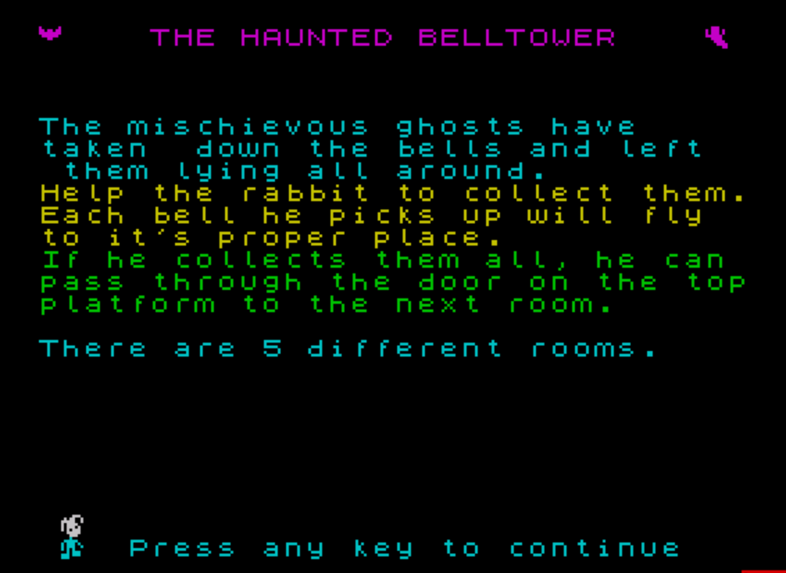 9205 PRINT INK 6;"Help the rabbit to collect them.Each bell he picks up will fly to it's proper place."