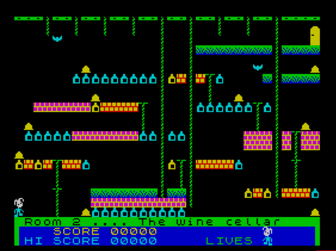 x1 = x + 3*((ATTR(x+2,y)=7) - (INKEY$=m$(3) AND ATTR(x-1,y)=4))— moves down 3 rows if the cell below has ATTR 7 (rope color), or up 3 rows if climbing key is pressed and rope is present above.y1 = y + (INKEY$=m$(2) AND y<31) - (INKEY$=m$(1) AND y>0)— horizontal movement, clamped to screen edges.