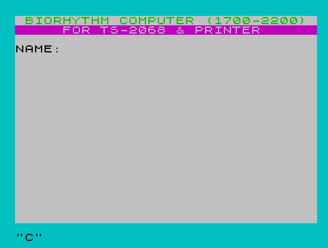 35 PRINT " BIORHYTHM COMPUTER (1700-2200) ": PRINT " FOR TS-2068 & PRINTER ": PRINT