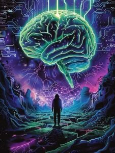 Brain Terrain is a text-based mystery/adventure game in which the player must identify a missing person’s home year by accessing memory zones labelled with single-letter keys (A, B, C, E, F, M, P, S, T, V). Each zone contains one or more encoded clues stored in a compressed string table; the player cycles through clues displayed with a scrolling marquee effect and ultimately guesses a four-digit year. Clue text is stored compactly in the string T$ using a delta-encoding scheme where each character’s code is offset relative to the first character of each entry, with comma (CHR$ 26 in this context) as a delimiter. A help feature, unlocked only after a failed guess, reveals the last words heard by the character Mr. Winkler.