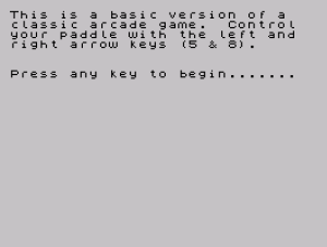 11 PRINT "This is a basic version of a classic arcade game. Control your paddle with the left and right arrow keys (5 & 8)."