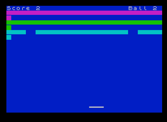 This is a Breakout-style paddle-and-ball game where the player deflects a bouncing ball to destroy rows of colored bricks, controlled via the 5 and 8 keys. The playing field consists of three rows of underscore characters rendered with INK and INVERSE attributes, and brick destruction is detected using SCREEN$ to read character data back from the display. Two UDGs are defined at runtime: UDG “a” is a filled circle (the ball sprite) and UDG “b” provides a flat base graphic. Ball speed is configurable at startup via a 1–10 scale that feeds a FOR/NEXT delay loop, and the game tracks lives (balls) with a limit of 10 before triggering Game Over. A brick count variable drives level resets, and the score increments each time a brick is hit.
