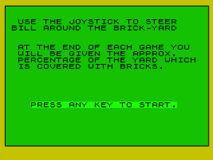 6150 PRINT PAPER 4; INK 0;AT 2,2;"USE THE CURSOR KEYS TO STEER BILL AROUND THE BRICK-YARD."