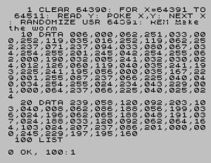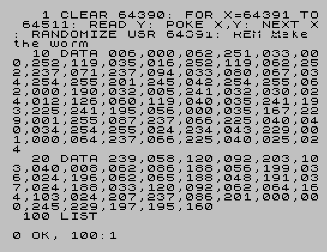 1 CLEAR 64390: FOR X=64391 TO 64511: READ Y: POKE X,Y: NEXT X: RANDOMIZE USR 64391: REM Make the worm