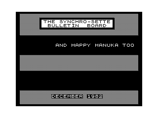 This is a Christmas-themed scrolling bulletin board display for the December 1982 issur of Synchro-Sette. It draws a bordered screen using block graphics and inverse-video characters, then animates two text strings (B$ and C$) rotating in opposite directions by slicing and reassembling the strings each loop iteration. After the animation, it alternately scrolls two long message strings (D$ and E$) across fixed screen rows one character at a time, with a keypress pause facility using INKEY$. Line 3 executes machine code at address 16514 via RAND USR, and line 4 POKEs the system variable at 16418 to suppress the usual display behaviour.