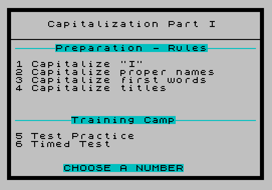 1020 PRINT AT 2,5;"Capitalization Part II";AT 7,1;"1 Proper names of groups";AT 8,1;"2 Geographical names";AT 9,1;"3 School subjects";AT 10,1;"4 Names of days and months";AT 16,1;"5 Test Practice";AT 17,1;"6 Timed Test";