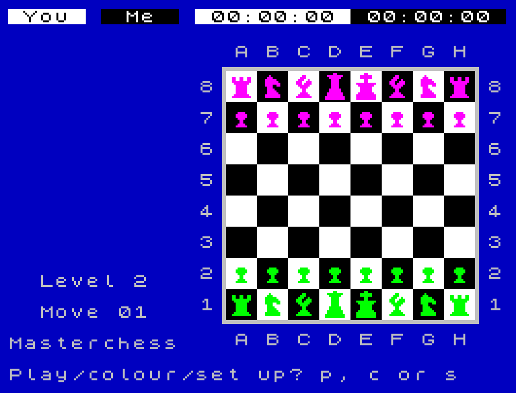 Classic Chess match between you and the computer. All legal moves including castling and empassant— high resolution graphics and 1 0 levels of play are supported. Special feature lets you set-up the board to study chess strategy. Find out who is the chess master— you or the computer!