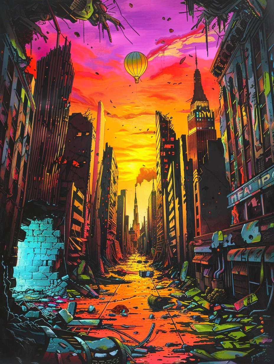 A post-apocalyptic text adventure set in a deserted Manhattan, where the player must navigate subway tunnels, city streets, a large library, a zoo, and a high-rise to retrieve medical supplies and escape by hot air balloon. The 60-location world is stored in a 60×160 character array (t$()), with room connections, light flags, and danger flags encoded in a parallel numeric array (m(r,d)). Five keys unlock specific doors by modifying the map array at runtime. The variable file carries all game state — room connections, object positions, and starting room — separately from the BASIC listing.