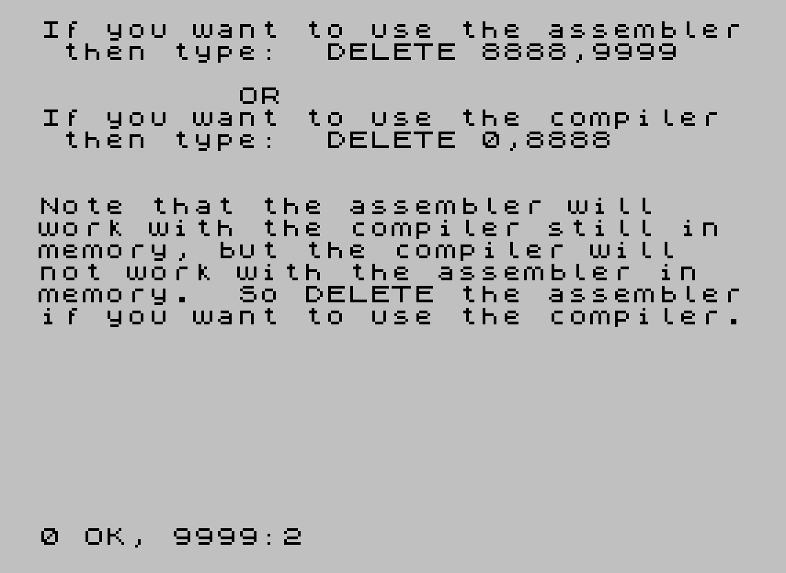 9999 CLS : PRINT "If you want to use the assembler then type: DELETE 8888,9999 OR If you want to use the compiler then type: DELETE 0,8888 Note that the assembler will work with the compiler still in memory, but the compiler will not work with the assembler in memory. So DELETE the assemblerif you want to use the compiler."