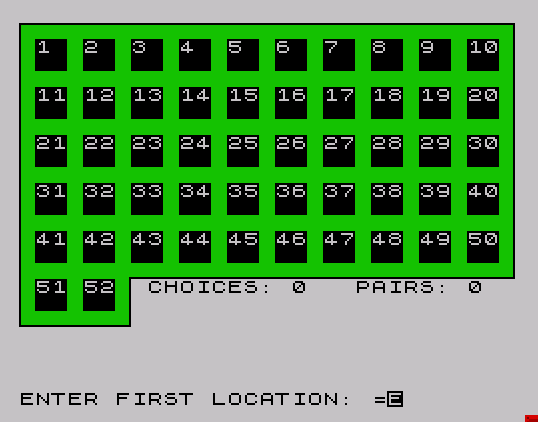 140 LET CH=0: LET PR=0: PRINT AT 16,8;"CHOICES: 0 PAIRS: 0"