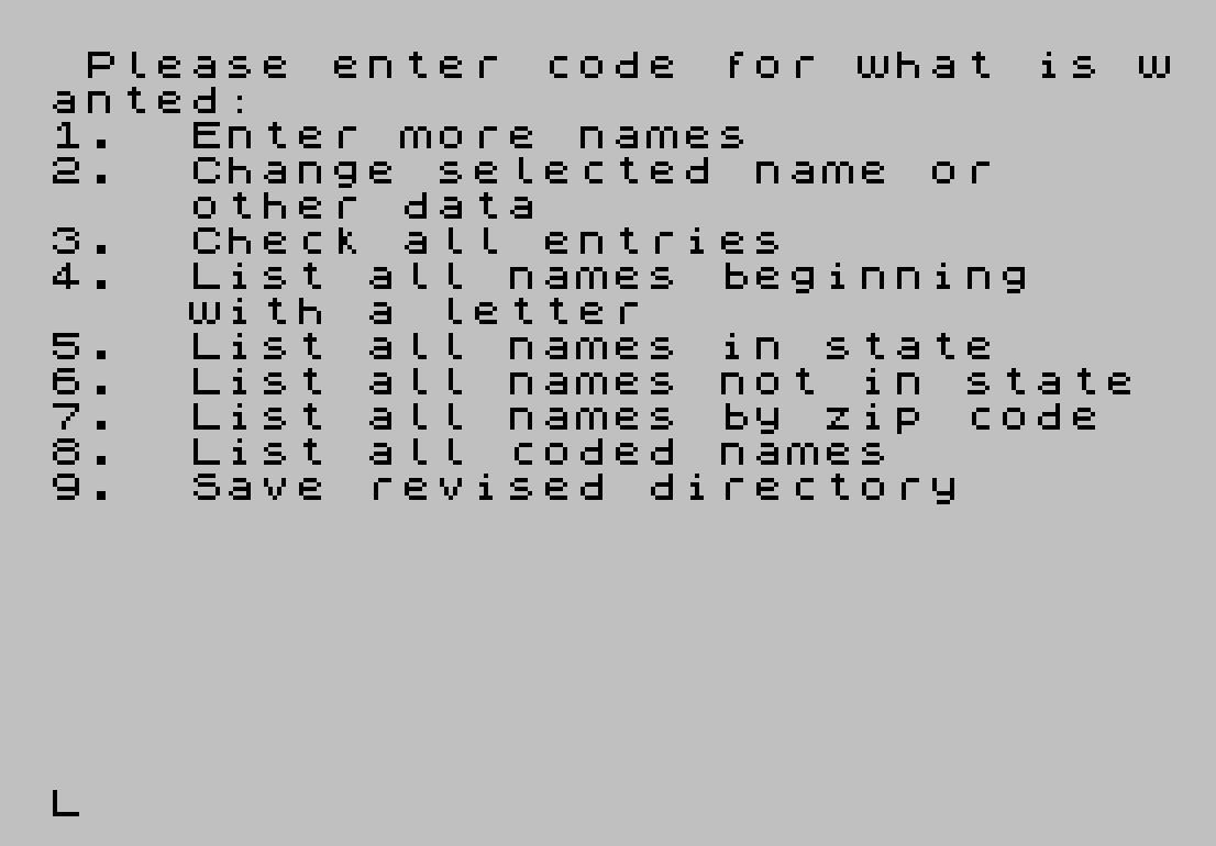 w$=n$(l, TO LEN w$)to compare only the leading characters of a name, enabling initial-letter or partial-name lookups. - Paginated display: Lines 465–497 implement a simple 4-record-per-page pager. After displaying a record, variable
