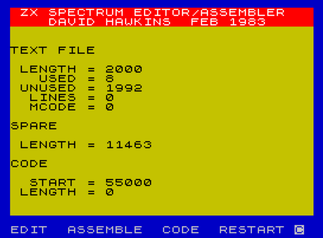 1 CLEAR 54999: BORDER 1: PAPER 6: POKE 23609,10: LET a=2000: GO TO 801: REM spectrum assembler from Your Computer November 1983. Entered by F. Chrysler