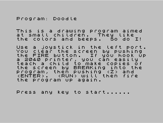 3 PRINT : PRINT "Use a joystick in the left port.You clear the screen by pushing the FIRE button. If you hook upa 2040 printer, you can easily teach a child to make copies of the screen by BREAKing into the program, then pushing <Z> and <ENTER>. <RUN> will then fire the program up again."