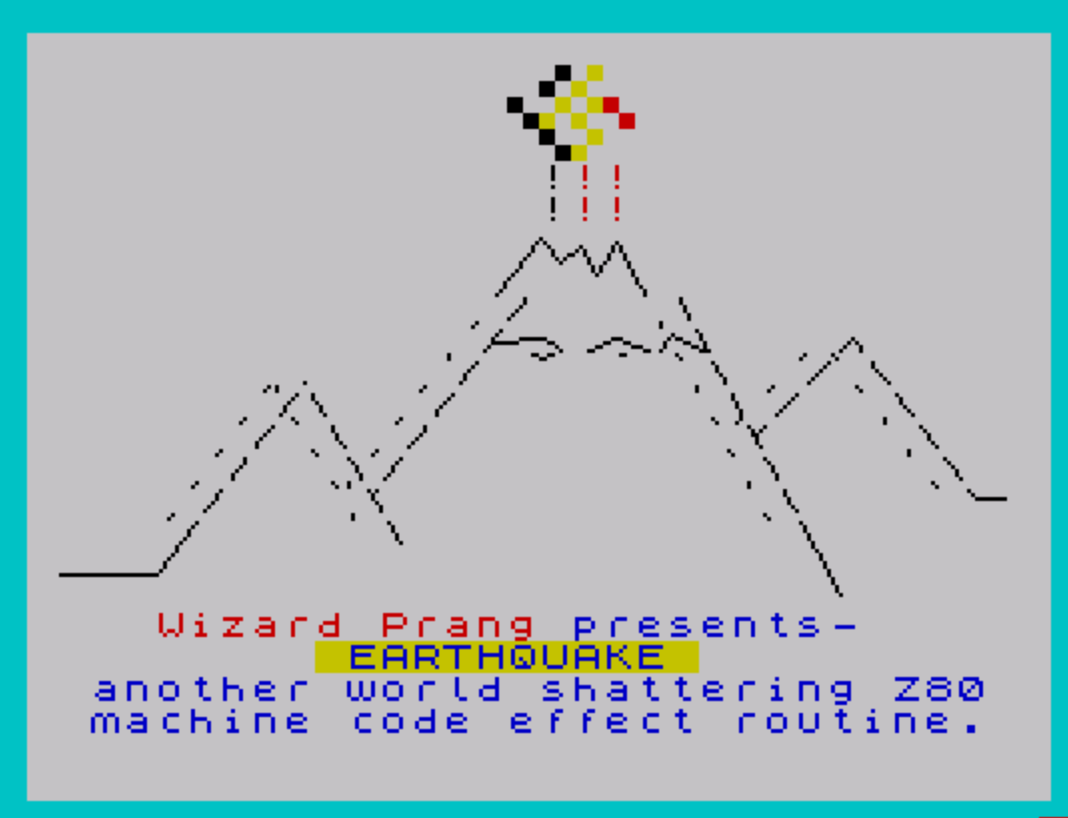 100 PRINT AT 18,0; INK 2;" Wizard Prang "; INK 1;"presents-"," "; PAPER 6;" EARTHQUAKE "; PAPER 7," another world shattering Z80 machine code effect routine."