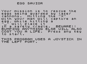 Egg Savior is an action game in which the player maneuvers a character around the screen to capture eggs guarded by laser cannons, using a joystick plugged into the left port. The player must touch an “X” marker to pick up an egg and then find an underscore “_” marker to safely deposit it into a cradle; contact with anything else costs a life. The program defines ten User Defined Graphics (UDGs “a” through “j”) via POKEs to USR addresses, loaded from DATA statements at lines 9030–9110, to draw the egg, cradle, and character sprites. Laser cannon fire is simulated by PLOT/DRAW lines that are erased with OVER 1 after a brief PAUSE, and the STICK keyword is used each frame to read joystick input from port 1. Collecting all six eggs triggers a congratulatory sequence and restarts the game board without resetting the high score.
