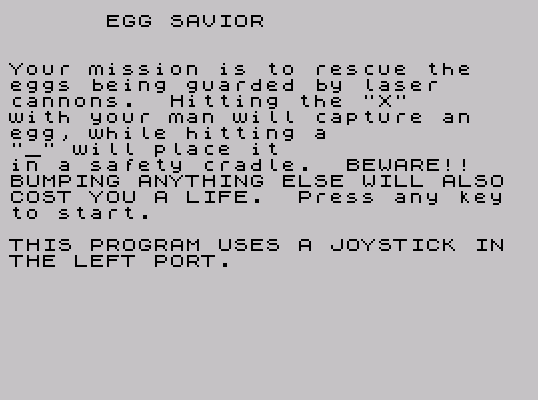 3 PRINT : PRINT : PRINT "Your mission is to rescue the": PRINT "eggs being guarded by laser ": PRINT "cannons. Hitting the ""X""": PRINT "with your man will capture an": PRINT "egg, while hitting a": PRINT """_"" will place it": PRINT "in a safety cradle. BEWARE!!": PRINT "BUMPING ANYTHING ELSE WILL ALSO": PRINT "COST YOU A LIFE. Press any key": PRINT "to start."