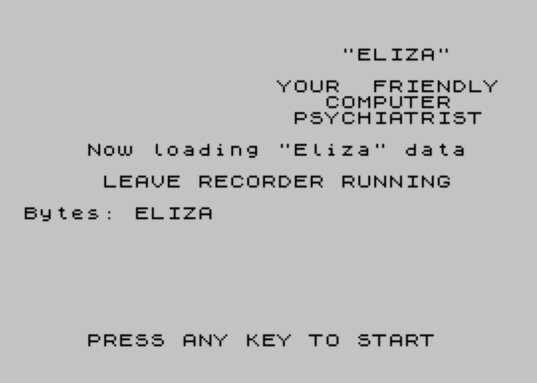 9999 CLEAR 63500: PRINT AT 9,4;"Now loading ""Eliza"" data",,," LEAVE RECORDER RUNNING": LOAD ""CODE 63514,1120: GO TO 10