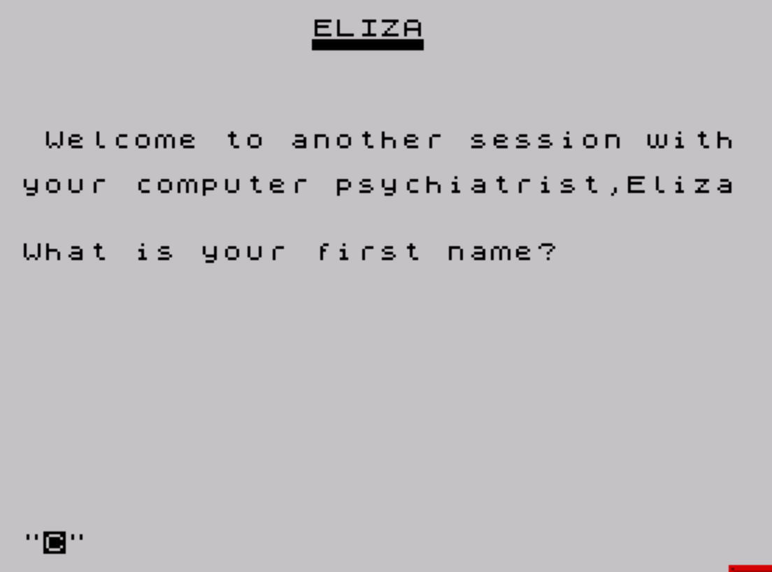 60 PRINT AT 5,0;" Welcome to another session with",,"your computer psychiatrist,Eliza"