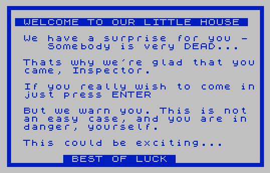 210 PRINT AT 17,0;"REMEMBER THEIR NAMES, INSPECTOR YOU WILL NEED THEM TO SOLVE THISMYSTERY."