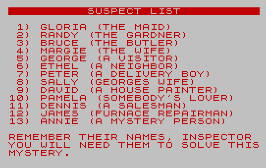 200 PRINT ,," 1) GLORIA (THE MAID)"," 2) RANDY (THE GARDNER)"," 3) BRUCE (THE BUTLER)"," 4) MARGIE (THE WIFE)"," 5) GEORGE (A VISITOR)"," 6) ETHEL (A NEIGHBOR)"," 7) PETER (A DELIVERY BOY)"," 8) SALLY (GEORGES WIFE)"," 9) DAVID (A HOUSE PAINTER)","10) PAMELA (SOMEBODY'S LOVER)","11) DENNIS (A SALESMAN)","12) JAMES (FURNACE REPAIRMAN)","13) ANNIE (A MYSTERY PERSON)"