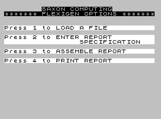 9010 CLS : PRINT TAB 8;"SAXON COMPUTING"'"******* FLEXIGEN OPTIONS *******"