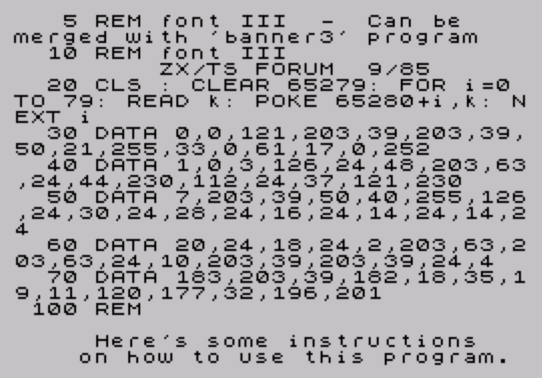 The line 5 and line 10 REM statements indicate this loader is intended to be MERGEd into a “banner3” program rather than run standalone. The publication credit in line 10 places this in ZX/TS Forum, September 1985. No anomalies or bugs are present; the byte count (0 TO 79 = 80 iterations) matches the DATA statements, which together supply exactly 80 comma-separated values.