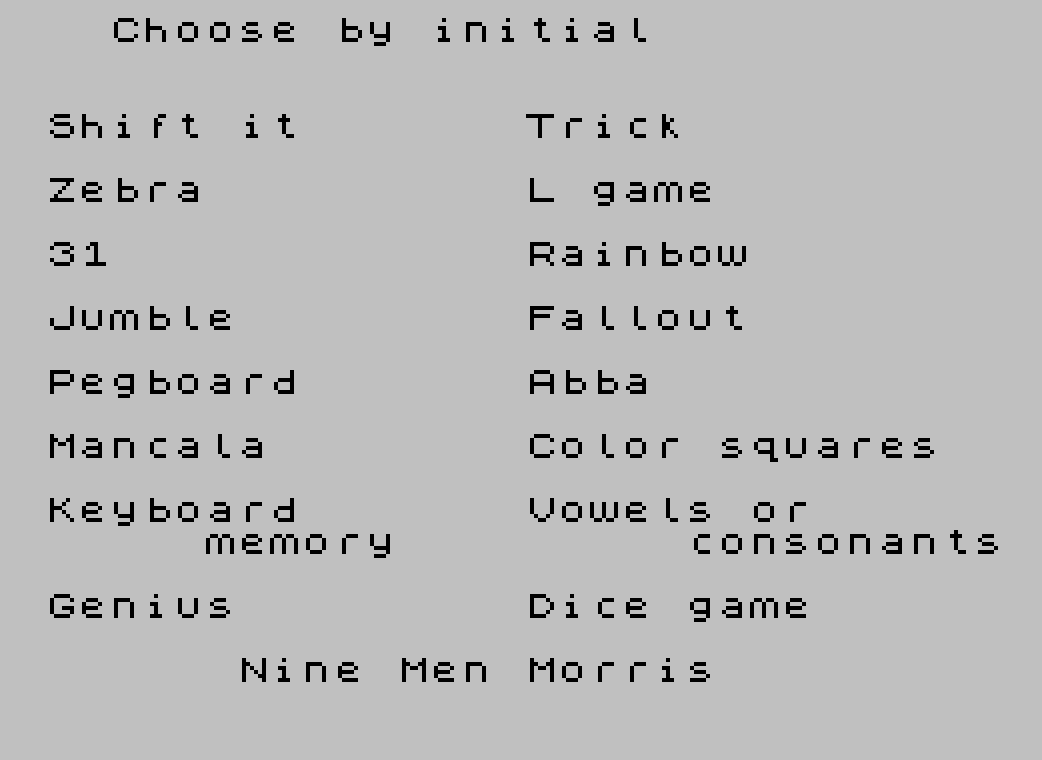 5 CLS : PRINT AT 0,3;"Choose by initial";AT 3,0;" Shift it";AT 5,0;" Zebra";AT 7,0;" 31";AT 9,0;" Jumble";AT 11,0;" Pegboard";AT 13,0;" Mancala";AT 15,0;" Keyboard";AT 16,6;"memory";AT 18,0;" Genius";AT 20,7;"Nine Men Morris";AT 3,16;"Trick";AT 5,16;"L game";AT 7,16;"Rainbow";AT 9,16;"Fallout";AT 11,16;"Abba";AT 13,16;"Color squares";AT 15,16;"Vowels or";AT 16,21;"consonants";AT 18,16;"Dice game"