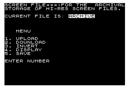 100 PRINT AT O,O;"%S%C%R%E%E%N% %F%I%L%E%=%=%=%>%F%O%R% %T%H%E% % %A%R%C%H%I%V%A%L%S%T%O%R%A%G%E% %O%F% %H%I%-%R%E%S% %S%C%R%E%E%N% %F%I%L%E%S%.% "