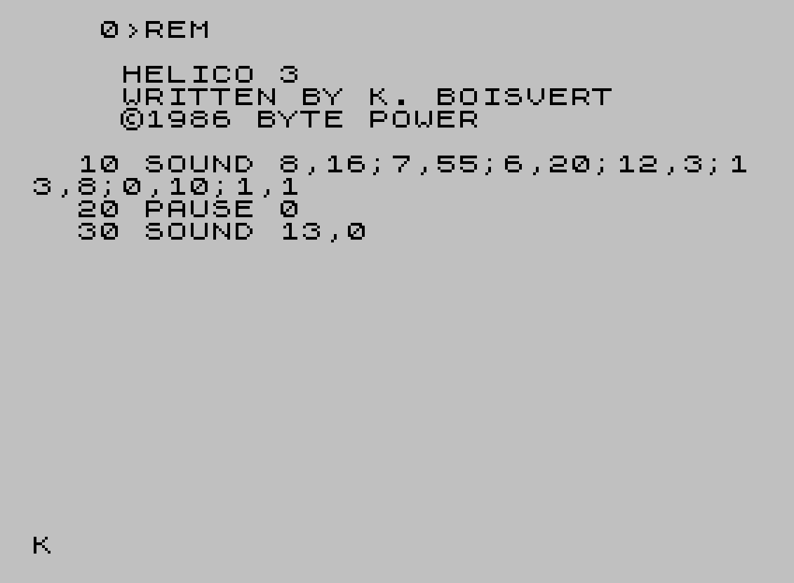 0 REM HELICO 3 WRITTEN BY K. BOISVERT ©1986 BYTE POWER