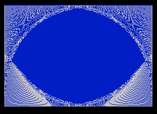 The choice of 174 as the upper y-bound reflects the Spectrum’s 175-pixel vertical resolution (0–174), and using STEP 2 halves drawing time while still producing a dense visual result.
