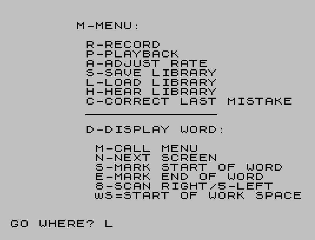 This program is a speech synthesis editor that manages a digitized word library stored in high memory, for use with Tad Painter’s Speech Synthesizer program, roughly from address 55000 to 65535.