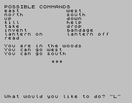 6000 DATA "east",21,N1,"west",22,N2,"north",22,N1,"south",23,N2,"up",18,N1,"down",19,N2,"kill",16,3,"help",20,4,"take",11,N1,"drop",12,N2,"invent",7,N1,"bandage",8,N2,"lantern on",7,4,"lantern off",3,3,"read",N2,N1