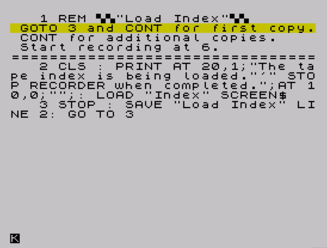 2 CLS : PRINT AT 20,1;"The tape index is being loaded."'" STOP RECORDER when completed.";AT 10,0;"";: LOAD "Index" SCREEN$