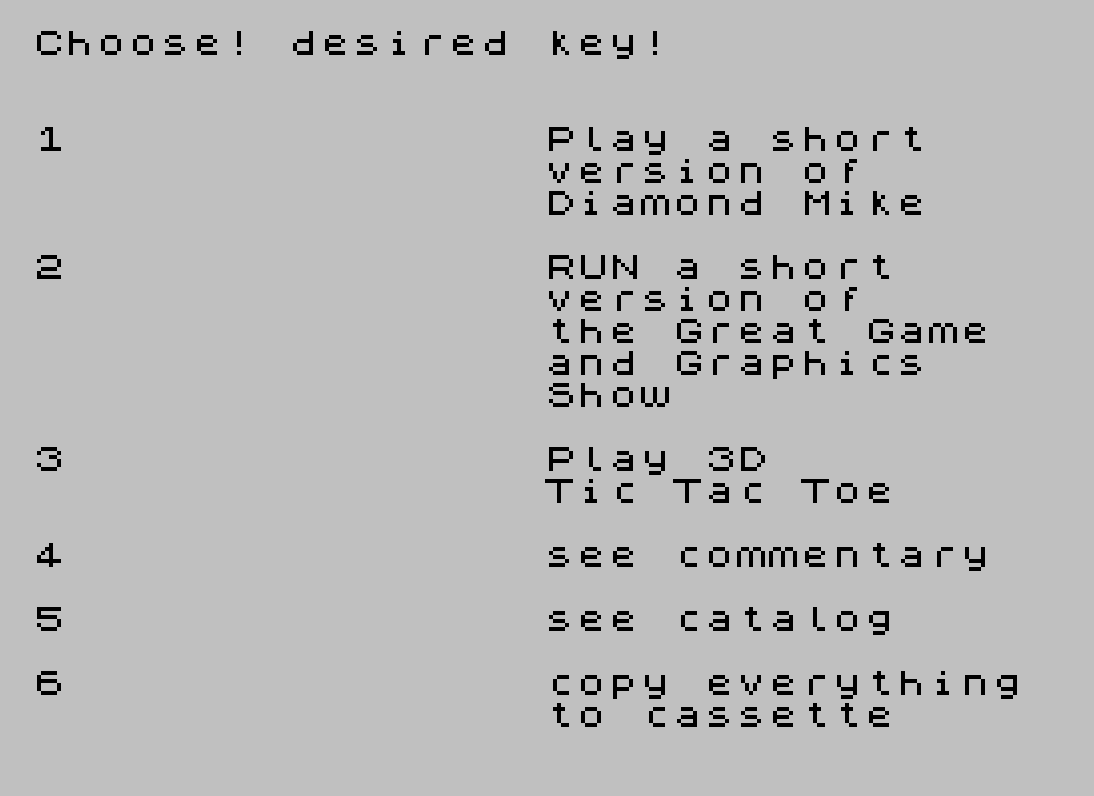 9200 PRINT "1","Play a short","","version of",,"Diamond Mike",,,"2","RUN a short",,"version of",,"the Great Game",,"and Graphics",,"Show",,,"3","Play 3D",,"Tic Tac Toe",,,"4","see commentary",,,"5","see catalog",,,"6","copy everything",,"to cassette"