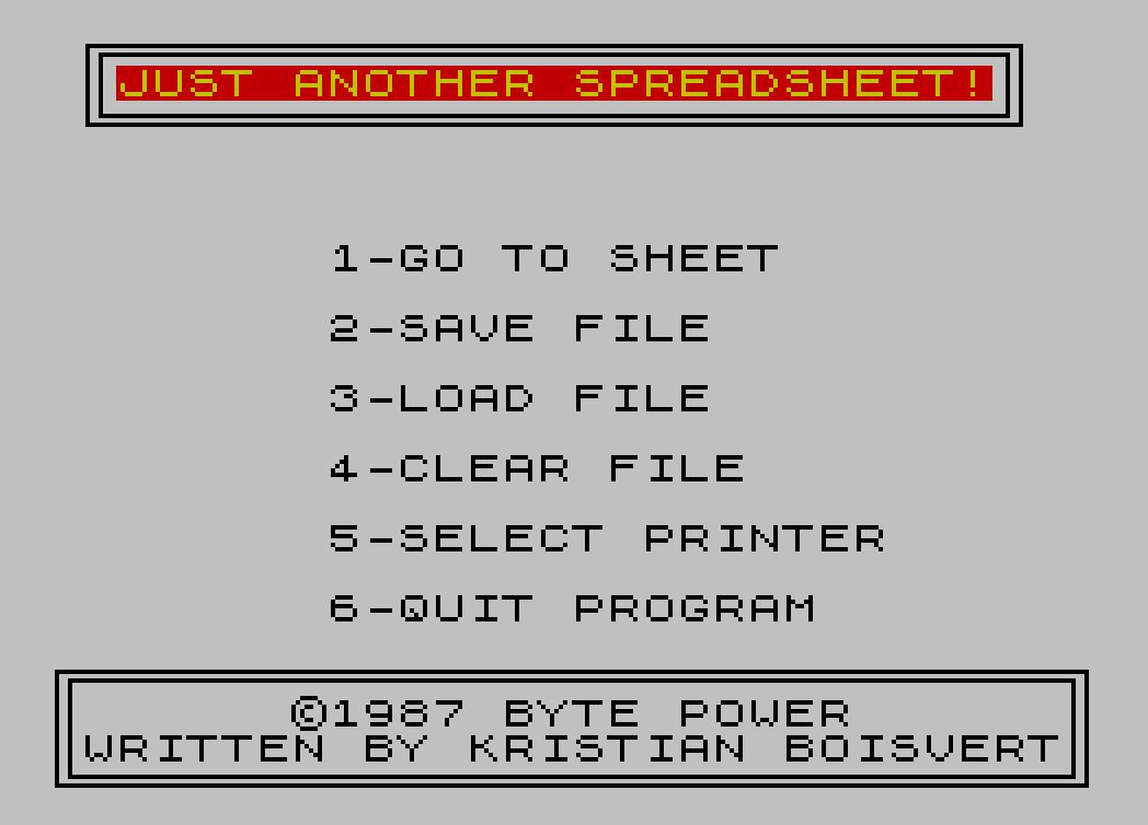 9000 CLS : PRINT AT VAL "8",VAL "3";"JUST ANOTHER SPREADSHEET!";AT VAL "10",VAL "8";"©1987 BYTE POWER";AT VAL "12",VAL "2";"WRITTEN BY KRISTIAN BOISVERT"