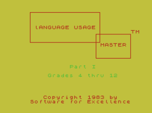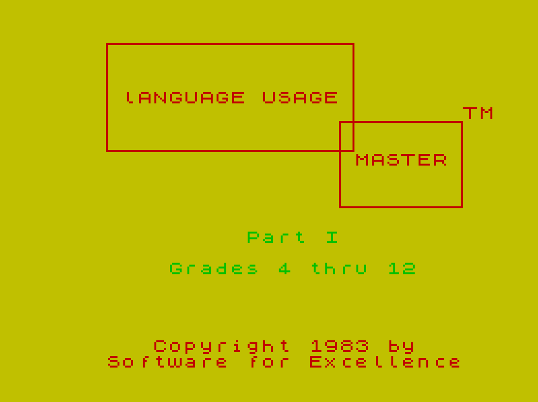 This is a three-part educational software suite called “Language Usage Master” targeting grades 4 through 12, covering grammar topics including subject/verb agreement, double negatives, pronoun usage, verb tense consistency, irregular verbs, may/can distinction, homonyms, lay/lie, set/sit, and among/between. Each part loads as a separate program file via LOAD, with a shared splash-screen loader that defines 12 User Defined Graphics (UDGs A–L) using POKE USR to render a diagonal-fill graphic logo. The suite offers three practice modes — a rules review screen, a drill mode, and a timed test requiring a password (“lan”) — and tracks per-category wrong answers in variables W1–W5 to produce a detailed score report with percentages. The timed test mode uses a PAUSE 60 loop with manual minute/second counters (K and L) to display elapsed time, and ON ERR with RESET and CONTINUE is used as an error-recovery trap throughout.