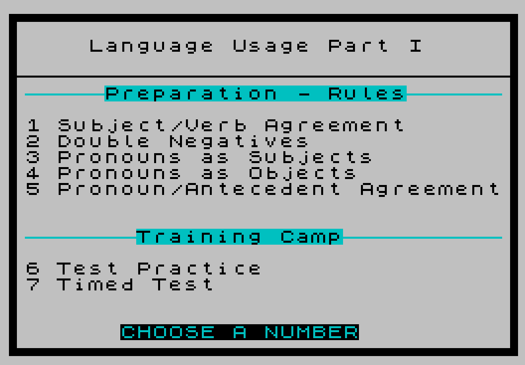 1020 PRINT AT 2,4;"Language Usage Part III";AT 7,1;"1 Homonyms";AT 8,1;"2 Lay and Lie";AT 9,1;"3 Set and Sit";AT 10,1;"4 Among and Between";AT 16,1;"5 Test Practice";AT 17,1;"6 Timed Test";