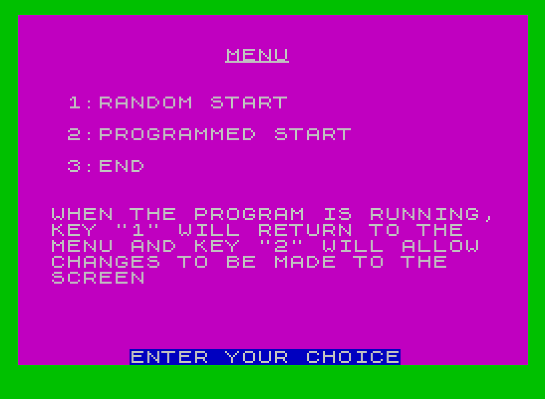 130 PRINT AT 12,2;"WHEN THE PROGRAM IS RUNNING, KEY ""1"" WILL RETURN TO THE MENU AND KEY ""2"" WILL ALLOW CHANGES TO BE MADE TO THE SCREEN"