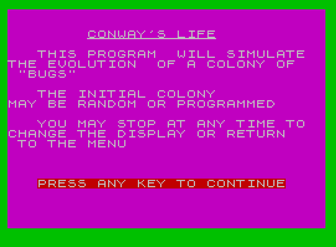 40 PRINT AT 8,3;"THE INITIAL COLONY "'"MAY BE RANDOM OR PROGRAMMED"